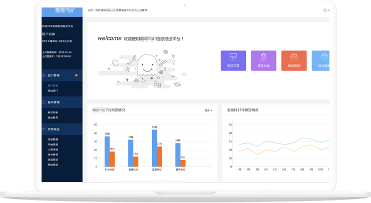信息报送系统是用电子化手段代替传统的传真、电话、邮件等介质,实现各级单位之间的重要信息、简报、专报、文件等信息的下发与上报,进行信息采编、发布及约稿管理,提高工作效率、加强各级部门之间(横向和纵向)的业务交流与信息共享。实现信息上报、信息采用、刊物制作、刊物送审、刊物发布、积分统计等功能的信息管理与服务平台。