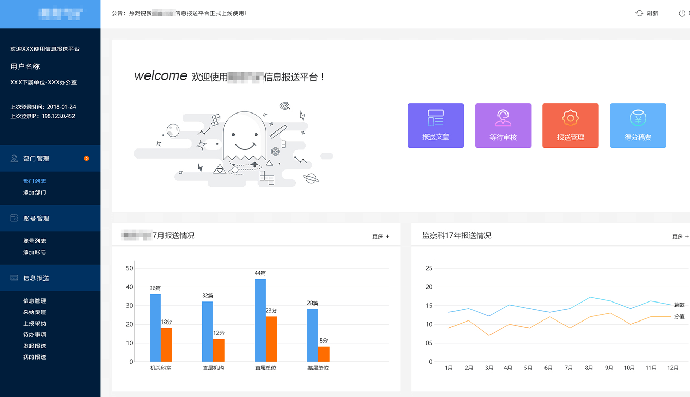 搭建公司的信息报送平台,主要为本单位的内网及其它需要投稿的栏目提供信息来源 通过信息报送系统进行年度工作任务的下达,信息的报送,审阅,任务统计,稿酬计算等 而且信息报送平台可以和内网系统进行对接,即节省了办公时间和资源又有效提高了工作效率。